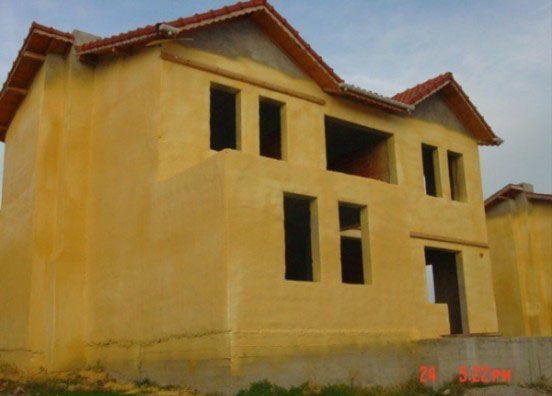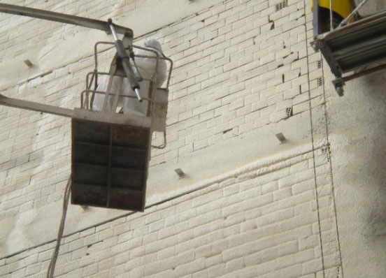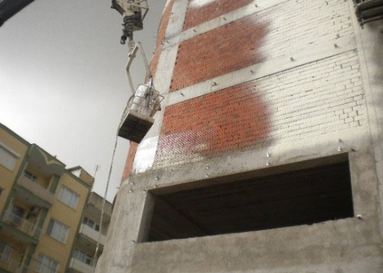 Dış cephe sprey poliüretan mantolama sistemi, inşaat halindeki binaların tuğla duvar dış cephe yüzeyine direkt olarak uygulanmakta ve üzerine rabitz teli dübellenmektedir.